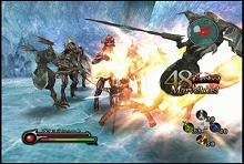 100 体以上のモンスターが一気に画面上に現れる強力な戦闘システムを採用しています。次から次へと迫り来るモンスターたちをボタン連打でなぎ倒し、Wii リモコンでのポインティングの仕方によって流れるようにスムーズな殺陣アクションも繰り出せます。また、取り囲むモンスターたちを一気に撃破できる強力な必殺技も用意し、簡単操作で爽快感を味わえる戦闘システムになっています。